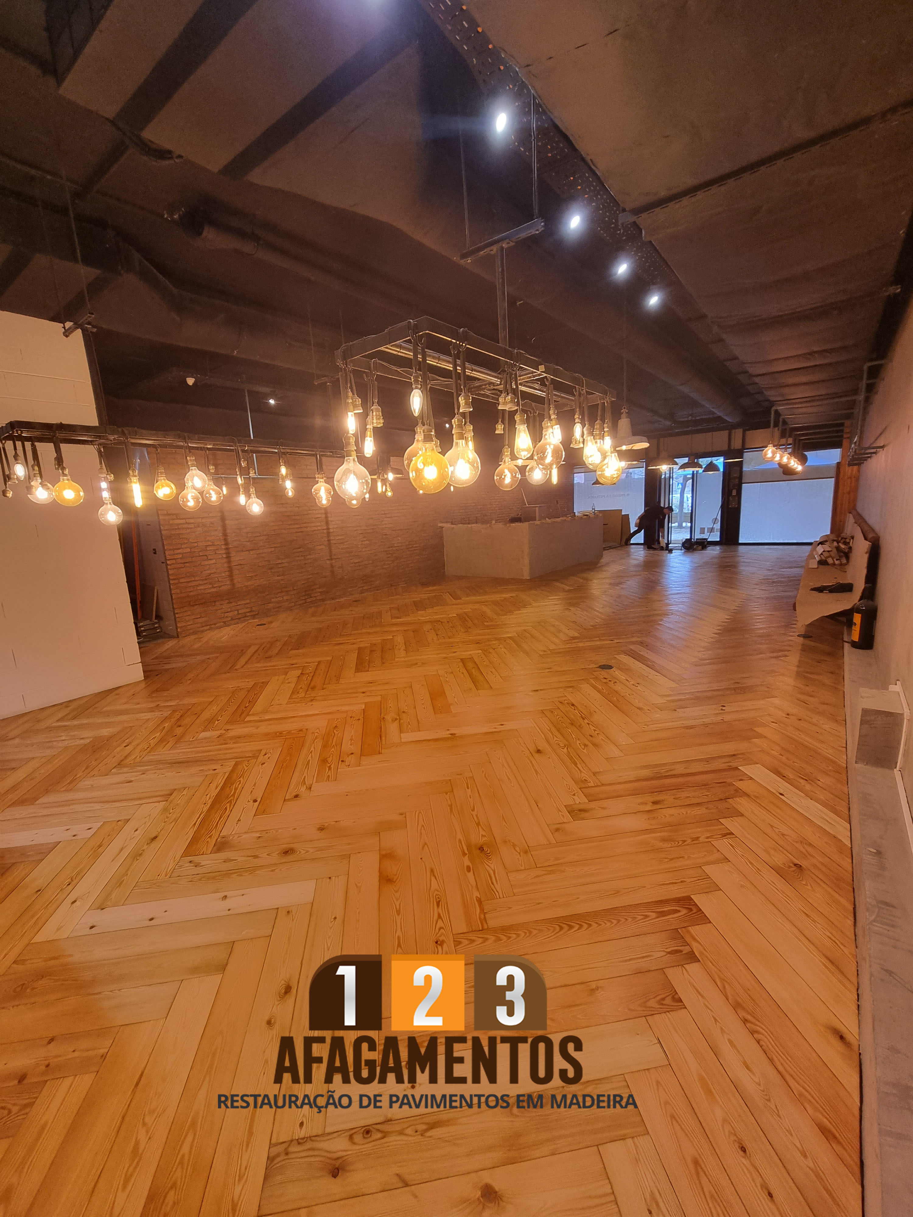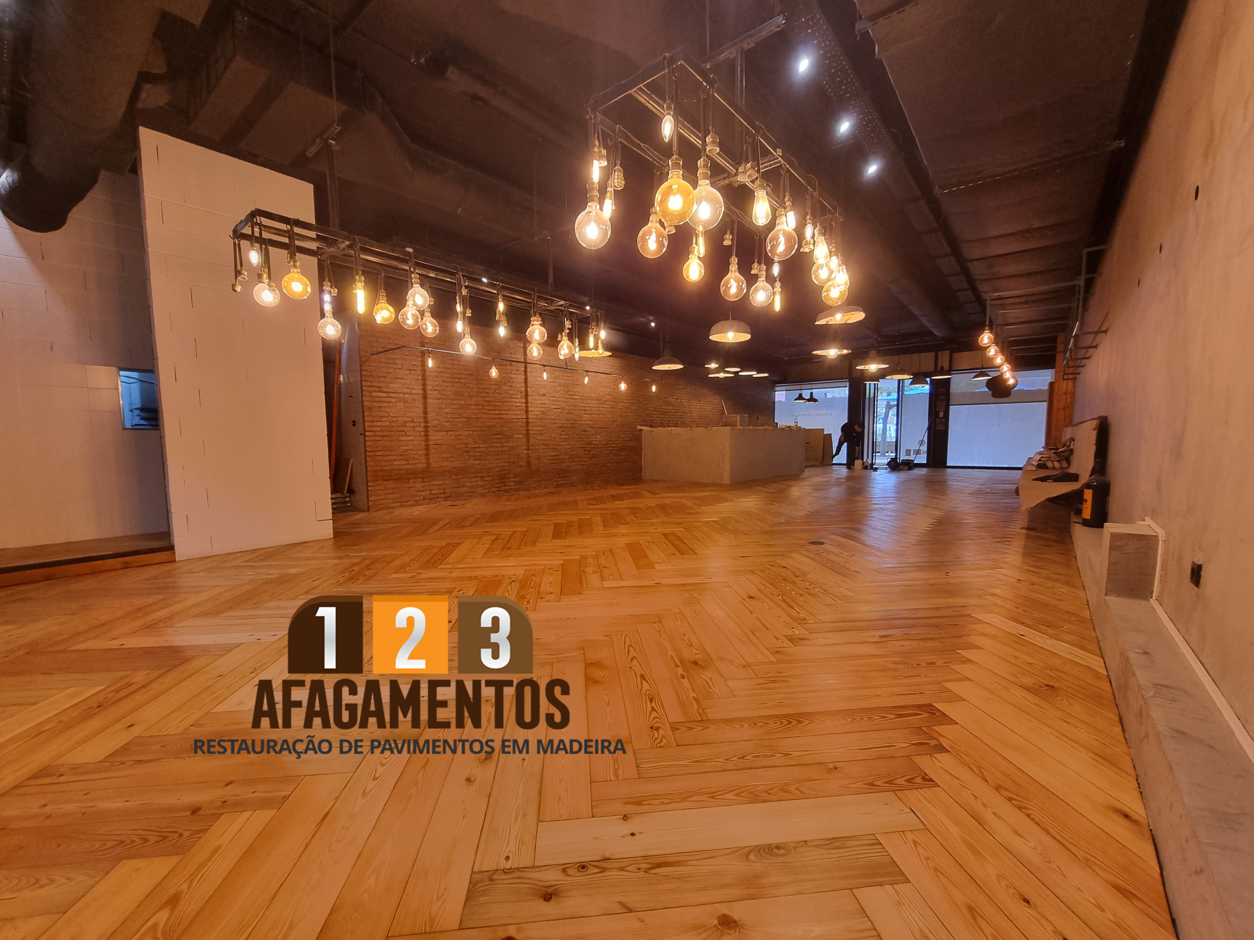 Desta vez fizemos uma intervenção num restaurante onde recentemente teve uma inundação, nesta obra substituiu-se uma parte do pavimento, fizemos o afagamento, betumamos as juntas e envernizamos o soalho com 3 camadas de verniz.